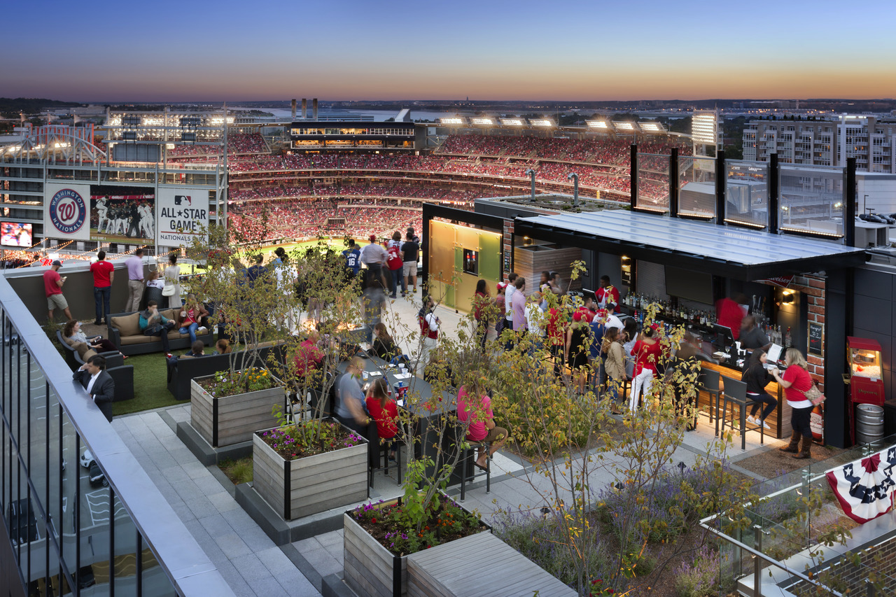 Roof top bar and grill with view of Nationals Park, Washington Monument, the Capitol, Anacostia River.
