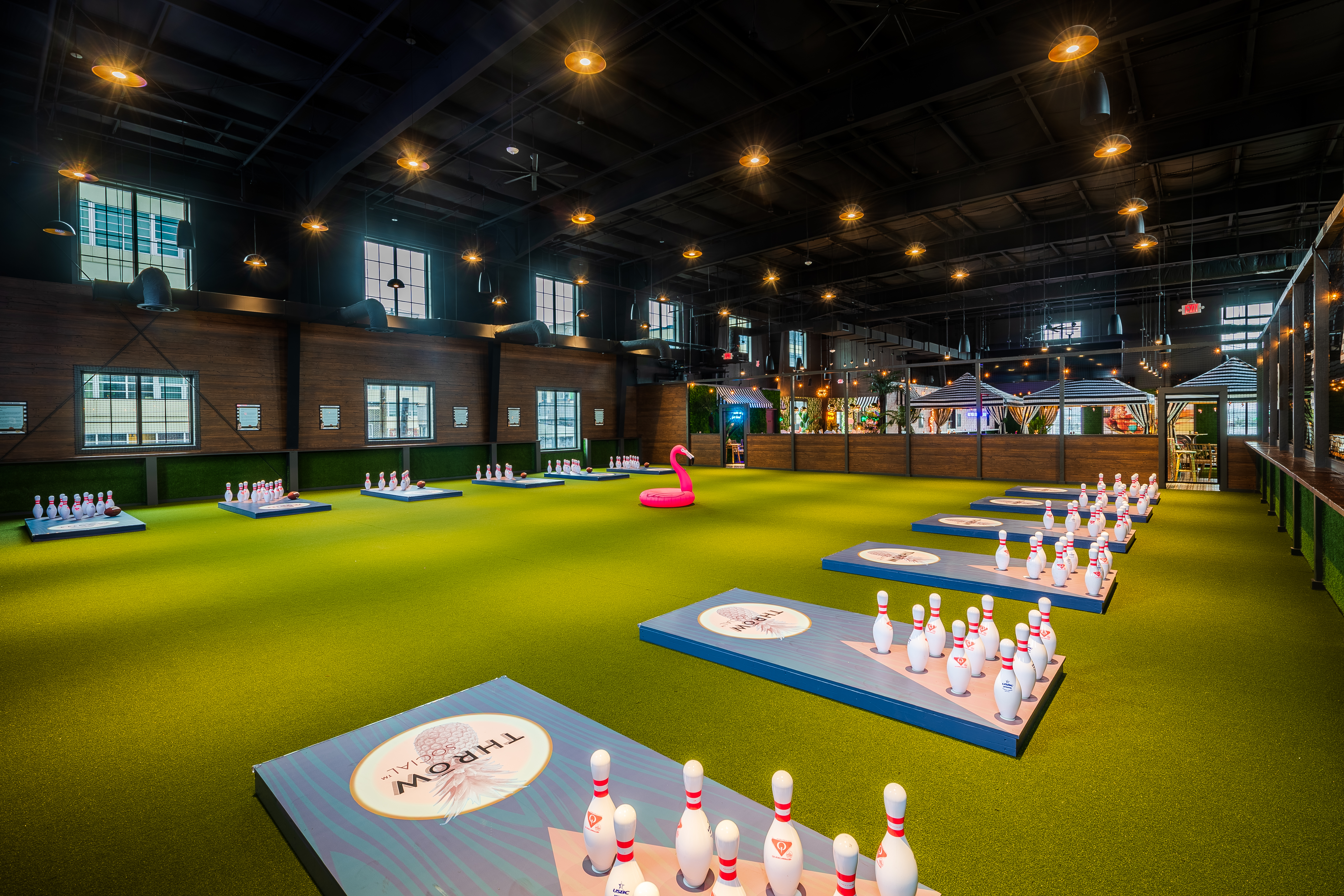 Flamingle upstairs at THRōW Social in an easy, breezy tropical atmosphere. Sip on specialty cocktails, indulge in mouthwatering food, and enjoy live DJs all day (or night!) long. Rent a VIP Cabana, play backyard-style games like corn hole & light-up ping-pong, then dance the night away!