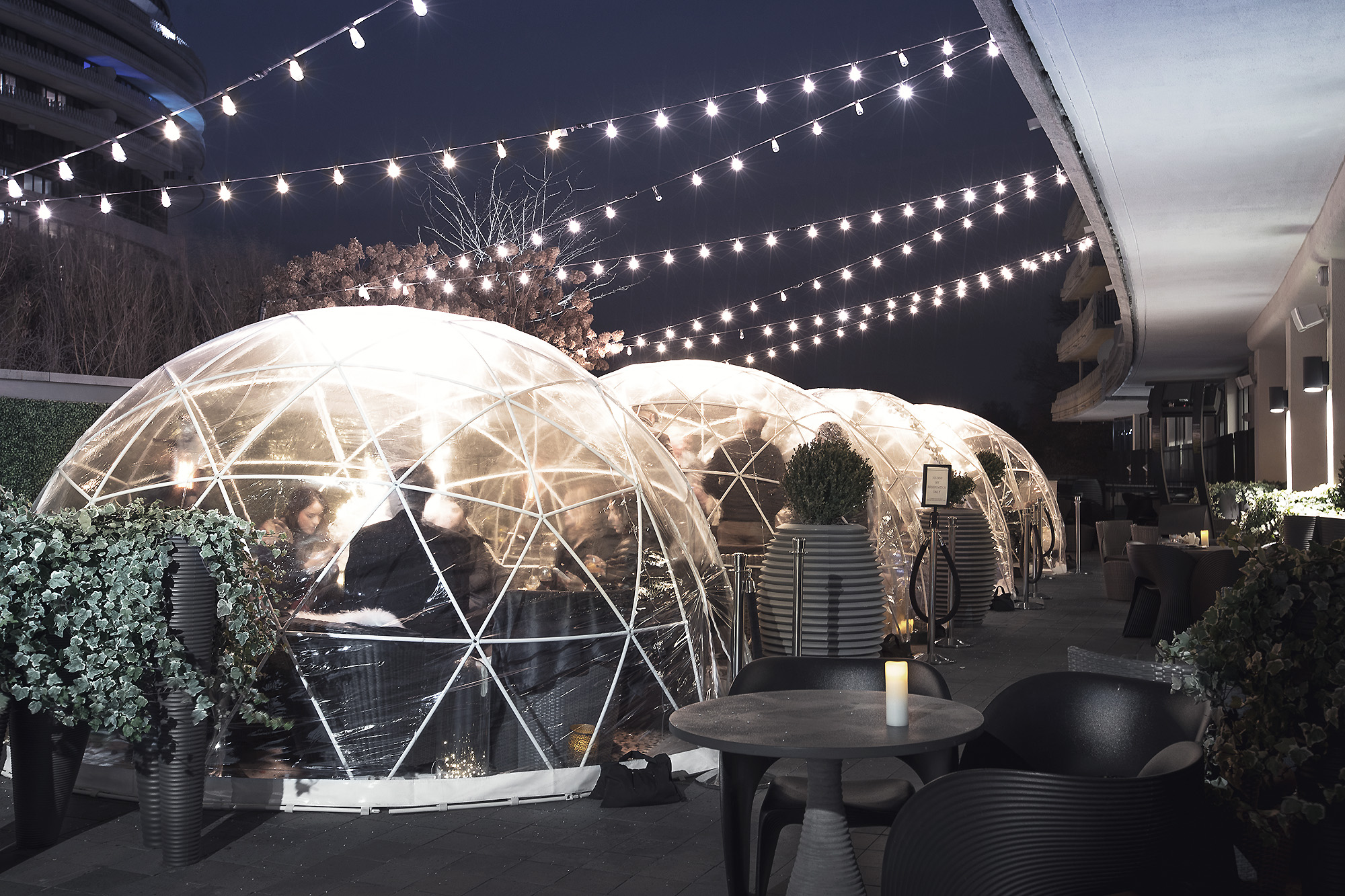 Food and beverage options include Top of the Gate - their rooftop bar and lounge, featuring panoramic city views and winter skating rink. The Next Whisky Bar is the perfect spot to gather and enjoy fine spirits. Private Winter Igloos illuminate the Whisky Terrace from November through March. Kingbird restaurant offers breakfast, lunch and dinner 7 days a week. Seating is available inside the stylish Kingbird dining room or on the outdoor terrace with Potomac views.