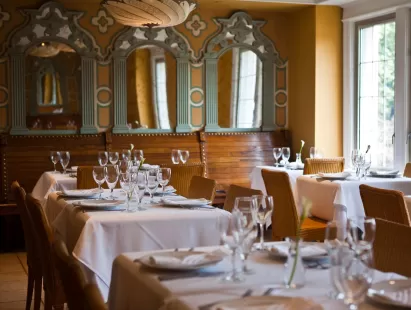An inviting warm sun-splashed European-inspired bistro offers authentic gourmet cuisine