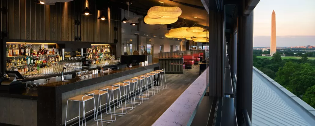 In a storied 1918 building, one of DC’s trendiest overnighters boasts two hip bars. The VUE, their rooftop restaurant and bar, overlooks The White House, the Washington Monument and the National Mall. Discover a truly iconic setting with floor-to-ceiling retractable windows which showcases breathtaking panoramic views. On the first floor is the high-ceilinged Lobby Bar, where modern meets luxury - tufted leather, lush velvet and violet-hued lighting - and blends with historic details like a black-and-white checkerboard floor and oversized arches. Both boast light fare menus and lure a trendy crowd, including many locals.
